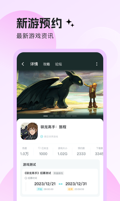 明日之星是一款专为游戏爱好者打造的官方交流社区应用,让你随时随地与志同道合的伙伴零距离互动,轻松分享攻略心得和游戏日常,还能抢先获取最新资讯和惊喜福利。你可以畅游专属游戏频道,参与热门话题讨论,寻找版本答案,享受高效实用的工具支持,让游戏体验更上一层楼。无论是新手还是资深玩家,都能快速上手,操作时间灵活自由,无需复杂步骤就能融入这个充满活力的社区。
