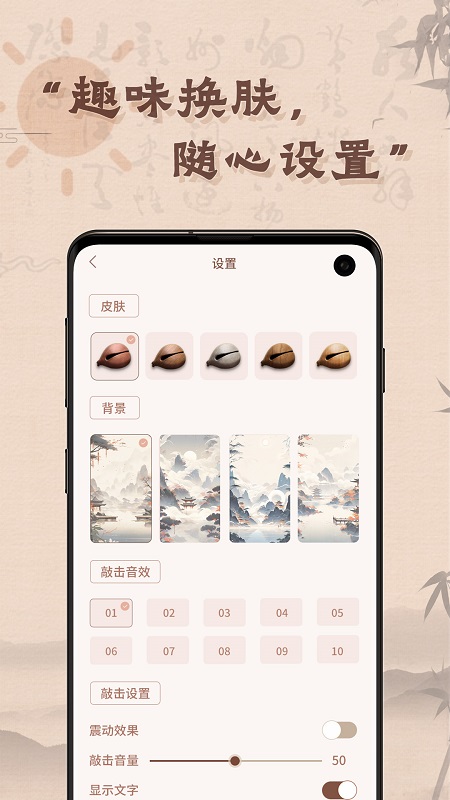 木鱼有心最突出的特色在于其深度的个性化定制能力。它提供了真正意义上的皮肤自定义,让你能随心装扮你的木鱼外观和应用背景,每一次使用都充满新鲜感。选择的多样性是其另一核心优势:多样的敲击音效、海量的背景皮肤、丰富的背景音乐库,以及随心切换的自动/手动模式,确保你能根据自己的心情和场景,找到最契合当下的组合。它还融入了轻量化互动元素,如自定义祝福文字和功德积累机制,让传统的木鱼敲击焕发出新的活力与趣味。