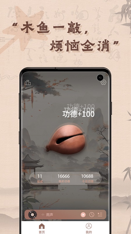 你的指尖就是木槌。只需轻轻点击屏幕,就能模拟真实的木鱼敲击,清脆空灵的声音瞬间帮你拂去浮躁。它提供了丰富的玩法选项:你可以随心选择手动敲击享受即时反馈的乐趣,也可以开启自动模式让节奏带着思绪沉淀。背景音乐库更是一大宝藏,从古典禅乐到现代轻音乐应有尽有,为你的敲击时刻营造完美氛围。个性化设置是它的灵魂——海量精美的木鱼皮肤与背景图任你切换,山水意境、趣味图案总有一款合你心意。更你可以自定义敲击时悬浮的文字,比如功德+1、烦恼-1或是专属祝福语,让每一次点击都充满意义。音效、音量同样能精细调节,打造属于你自己的专属禅意空间。